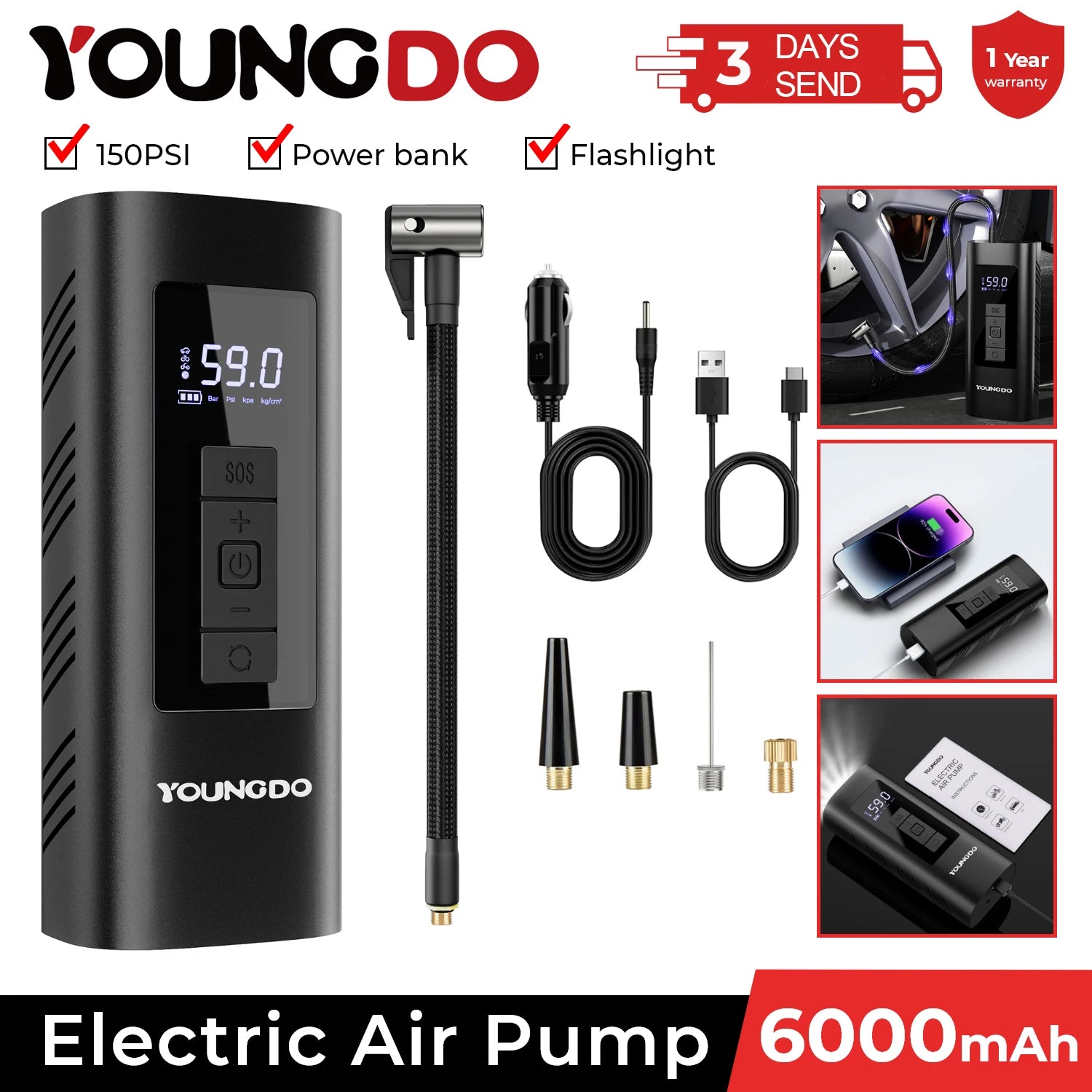 YOUNGDO Car Air Compressor Portable Tire Inflator 150 PSI & 6000mAh Smart Digital Inflatable Pump For Car Bicycle Boat Air Pumps